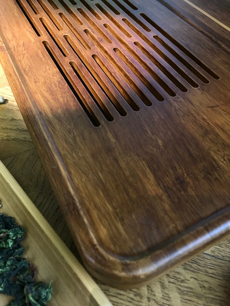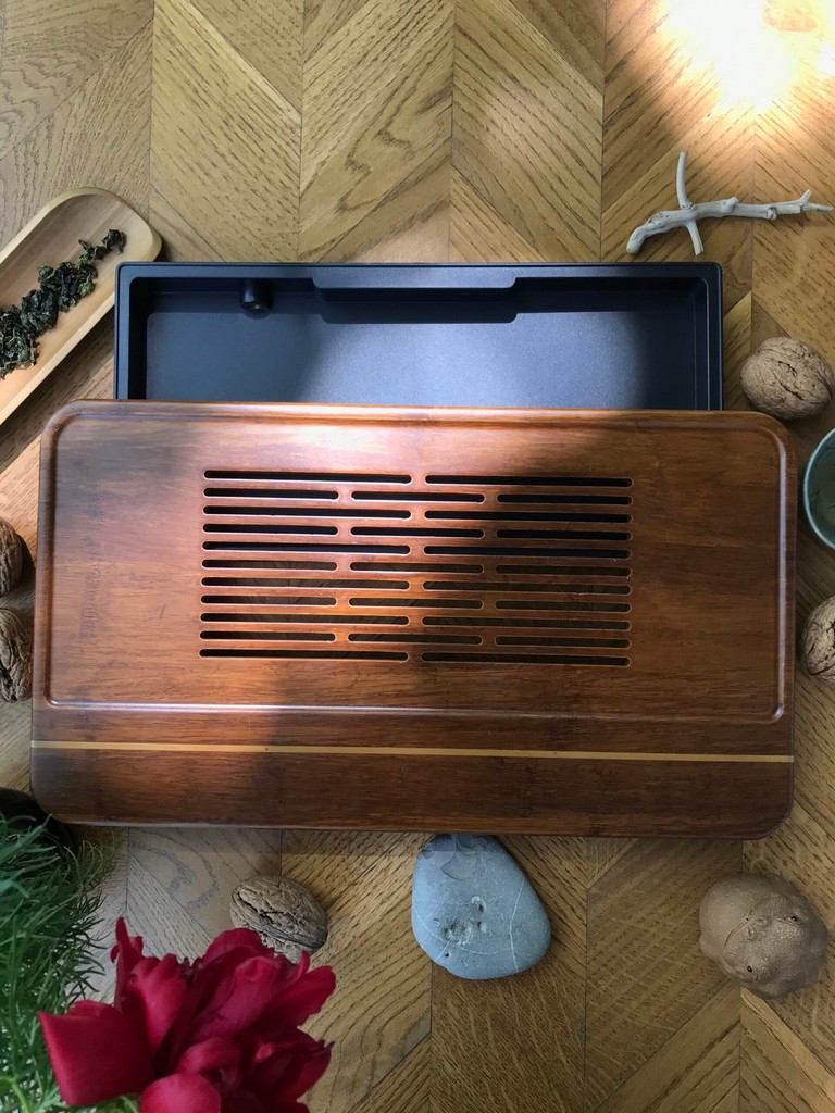 Елегантна чайна дошка, виготовлена з високоякісного бамбука з натуральною текстурою. Простора поверхня ідеально підходить для розміщення різноманітних чайних сервізів та приладдя. Водостічний ящик виготовлений із нешкідливого пластику, який не вбирає запахи. Ніжки дошки забезпечують стійкість та захист від ковзання.