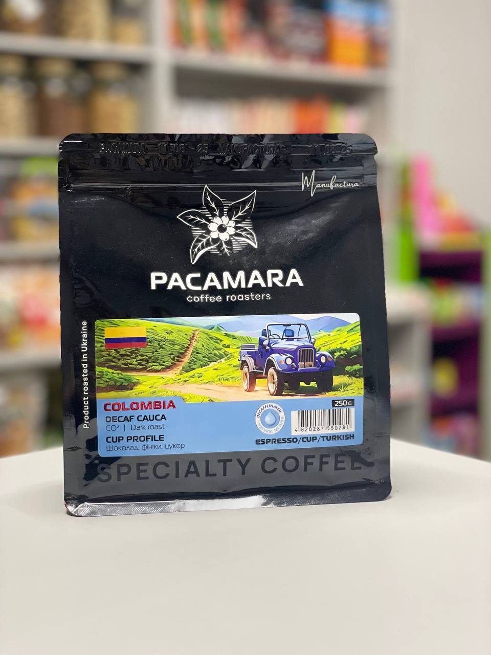 Кава в зернах Pacamara Colombia без кофеїну 100% арабіка 250 г — це преміальна зернова кава для щоденного вживання, яка вирізняється ніжним, збалансованим смаком та витонченим ароматом високоякісної арабіки, без вмісту кофеїну.