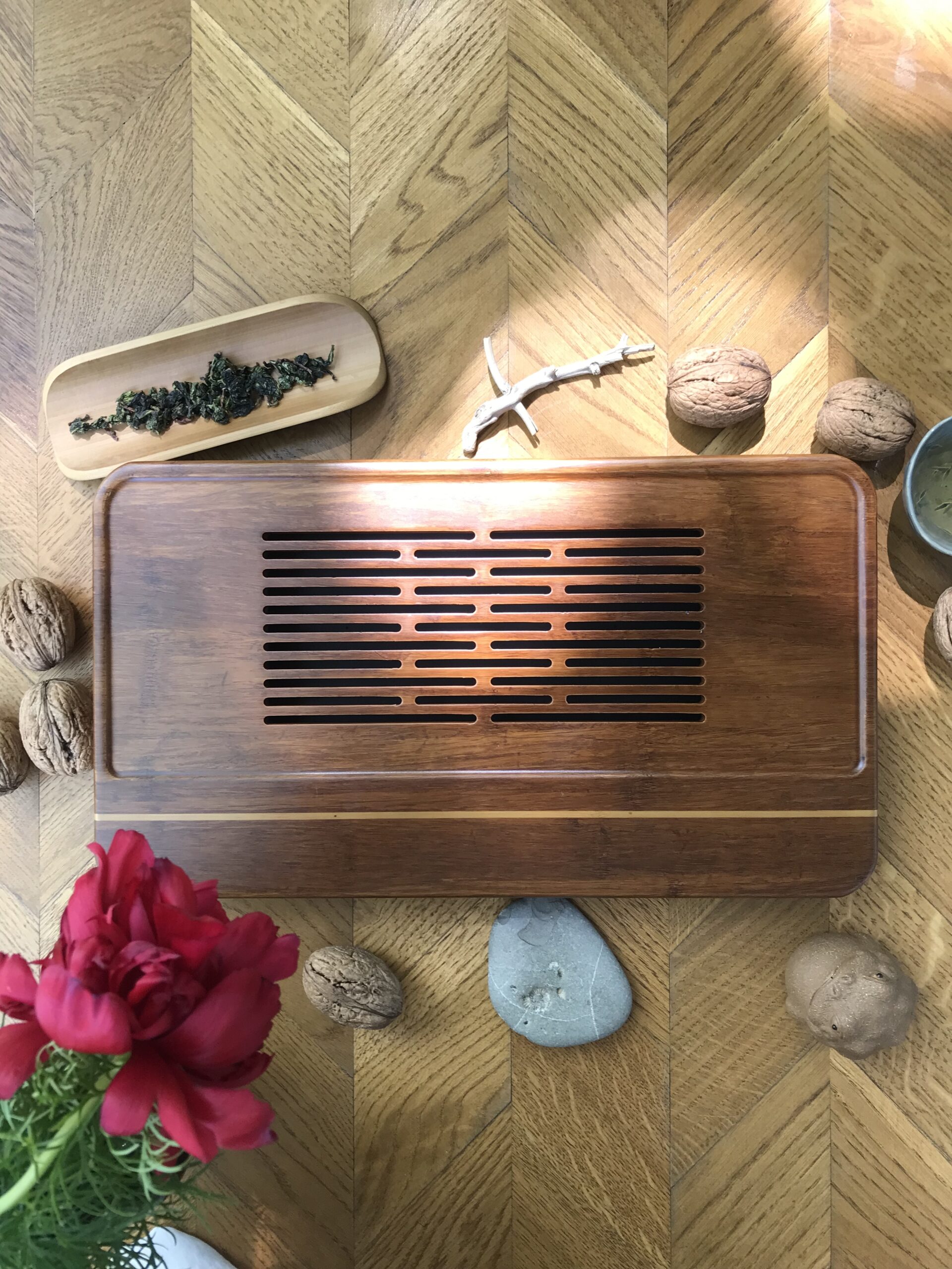 Елегантна чайна дошка, виготовлена з високоякісного бамбука з натуральною текстурою. Простора поверхня ідеально підходить для розміщення різноманітних чайних сервізів та приладдя. Водостічний ящик виготовлений із нешкідливого пластику, який не вбирає запахи. Ніжки дошки забезпечують стійкість та захист від ковзання.