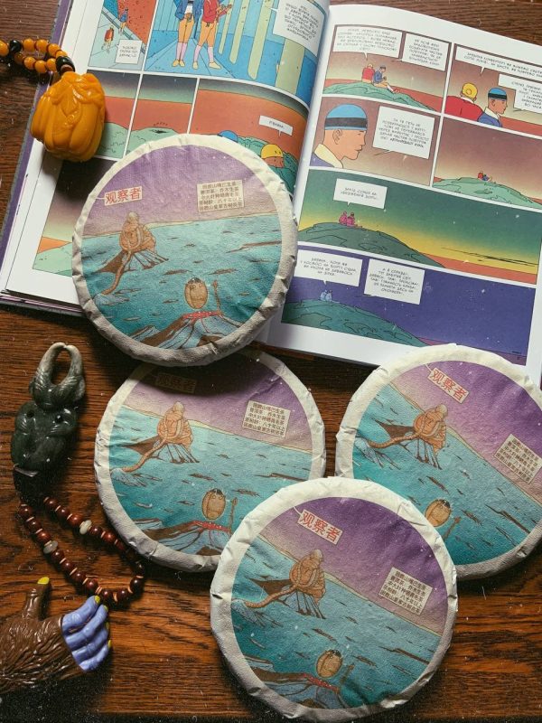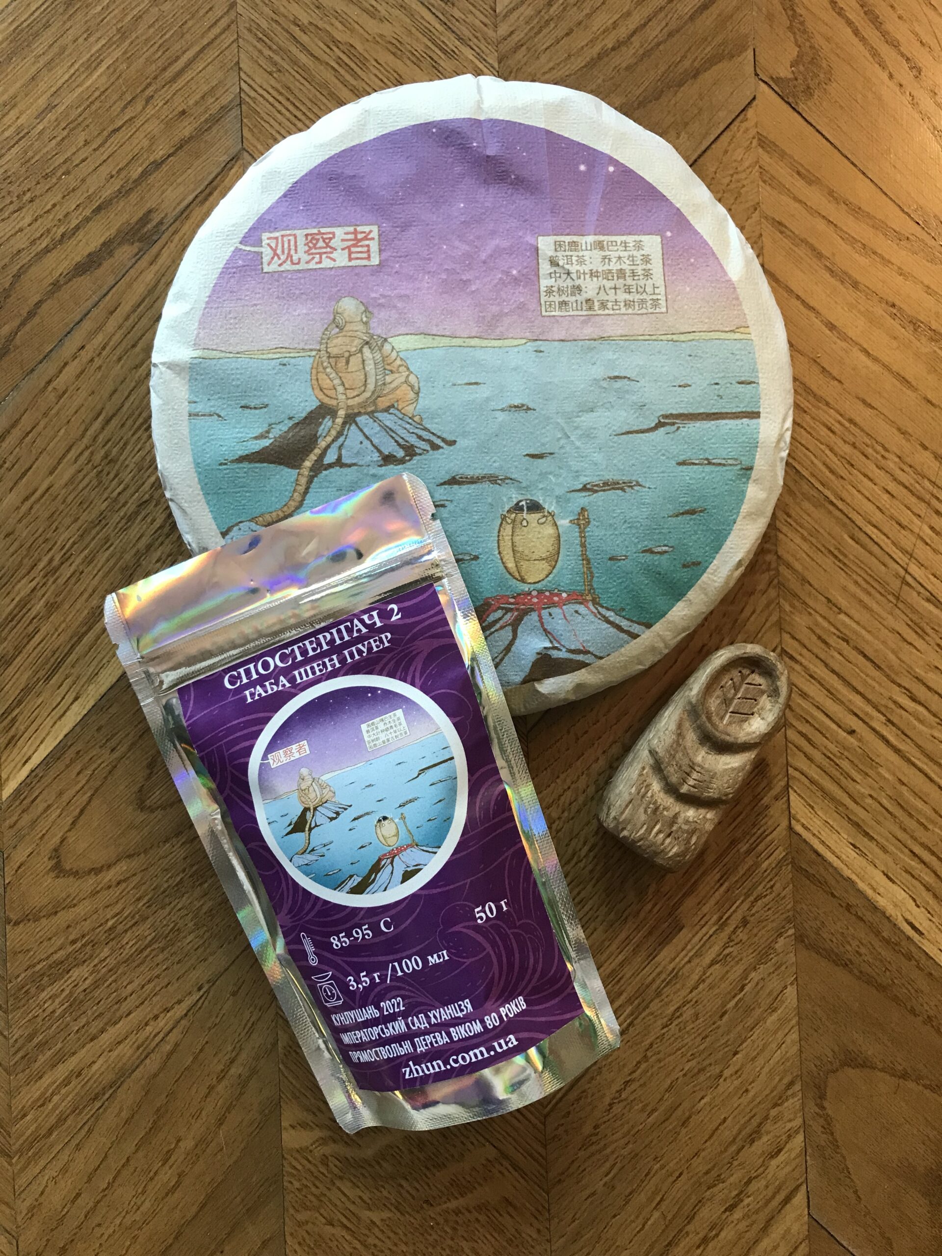 Габа шен пуер «Спостерігач» Кунлушань 2022 Імператорський сад Хуанцзя Прямоствольні дерева віком 80 років Ферментація на 10% сильніша ніж у попередньому «спостерігачі», персонаж на обкладинці – той самий Обкладинка – Рома Мензатул