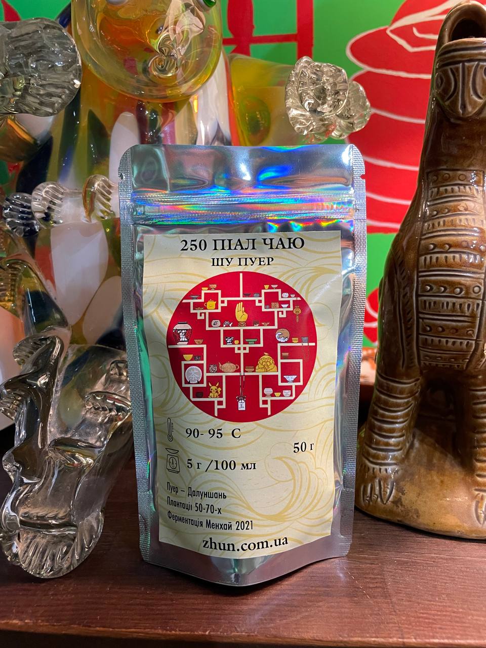 Шу пуер 250 ПІАЛ ЧАЮ Пуер – Далуншань, плантації 50-70-х, ферментація Менхай 2021. Смак класичний, багато солодощів та шоколаду. Ідея – ДАМО Обкладинка – Агенція СВОЇ СВІТ КРАСОЮ ВРЯТУЄТЬСЯ 50г