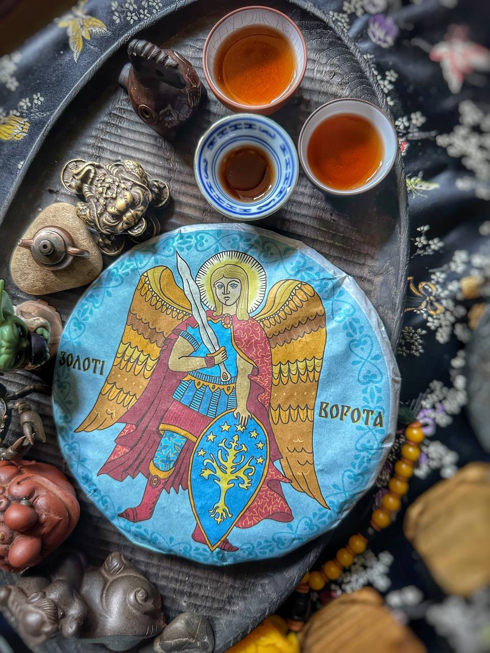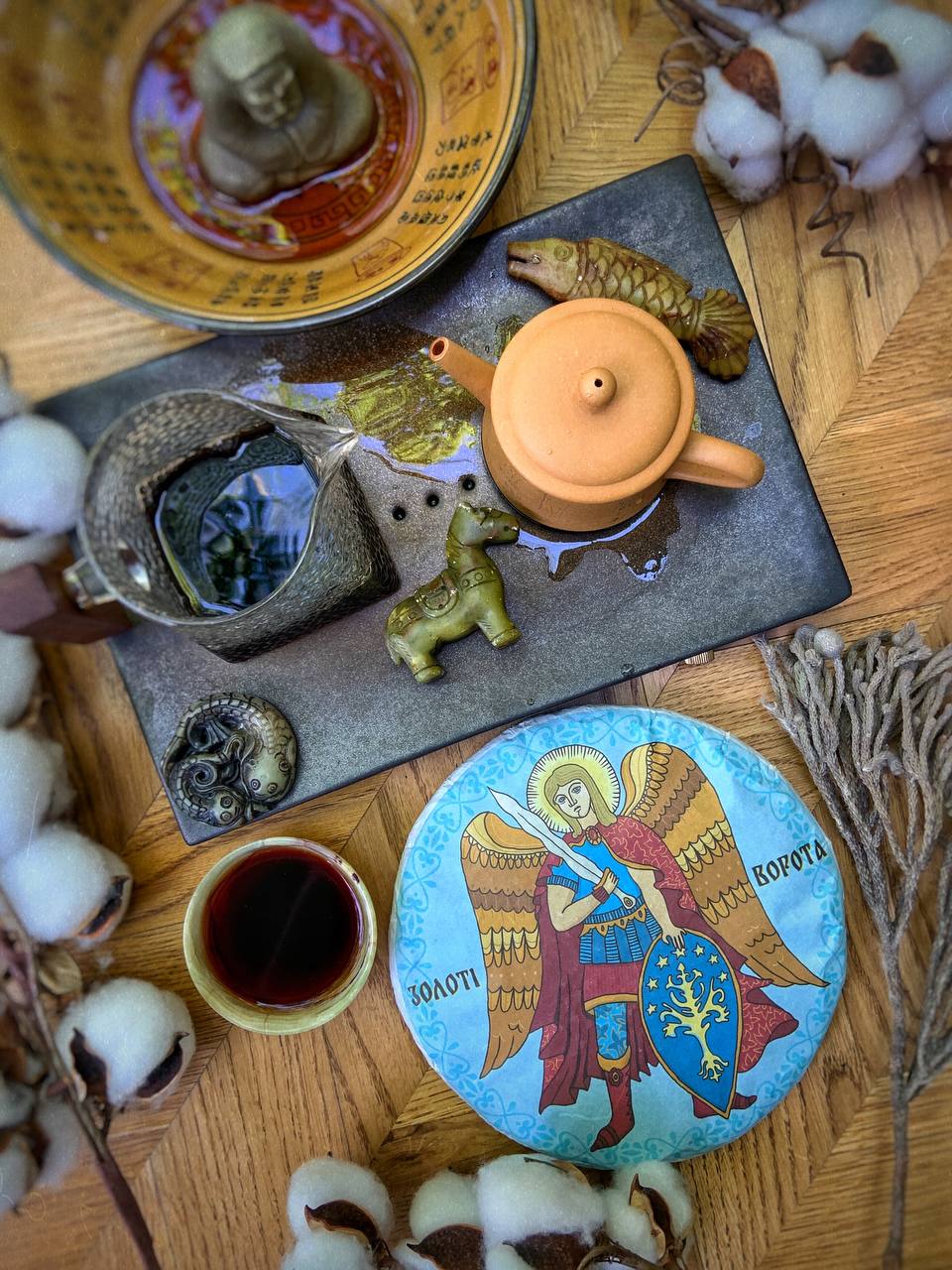 Збір з Гор Цзіношань, Юньнань Стародавні чайні дерева Ферментація - Менхай Повністю ручна робота 2022 рік Обкладинка - Олена Пархісенко Ідея - Дамо Вага 360 грам Міцний, горіховий, смачний, вершковий, солодкий, мабуть трохи фруктовий.
